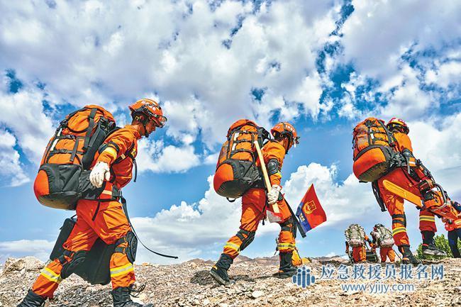 克州消防救援支队指战员在地震救援演练中手持新型轻量化装备向模拟“震中”区域徒步行进。潘晨曦 摄